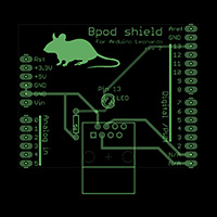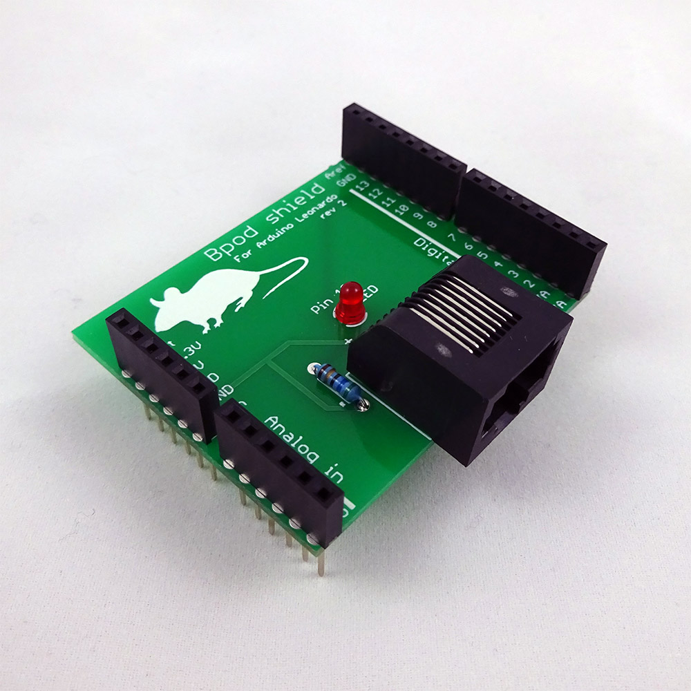 The Bpod Arduino Shield interfaces a UART serial connection from Bpod with an Arduino Leonardo. As further explained on the Bpod wiki, this allows Bpod to send bytes to a separate microcontroller with low latency, and provides an interface to the wide range of Arduino shields (expansion boards).
